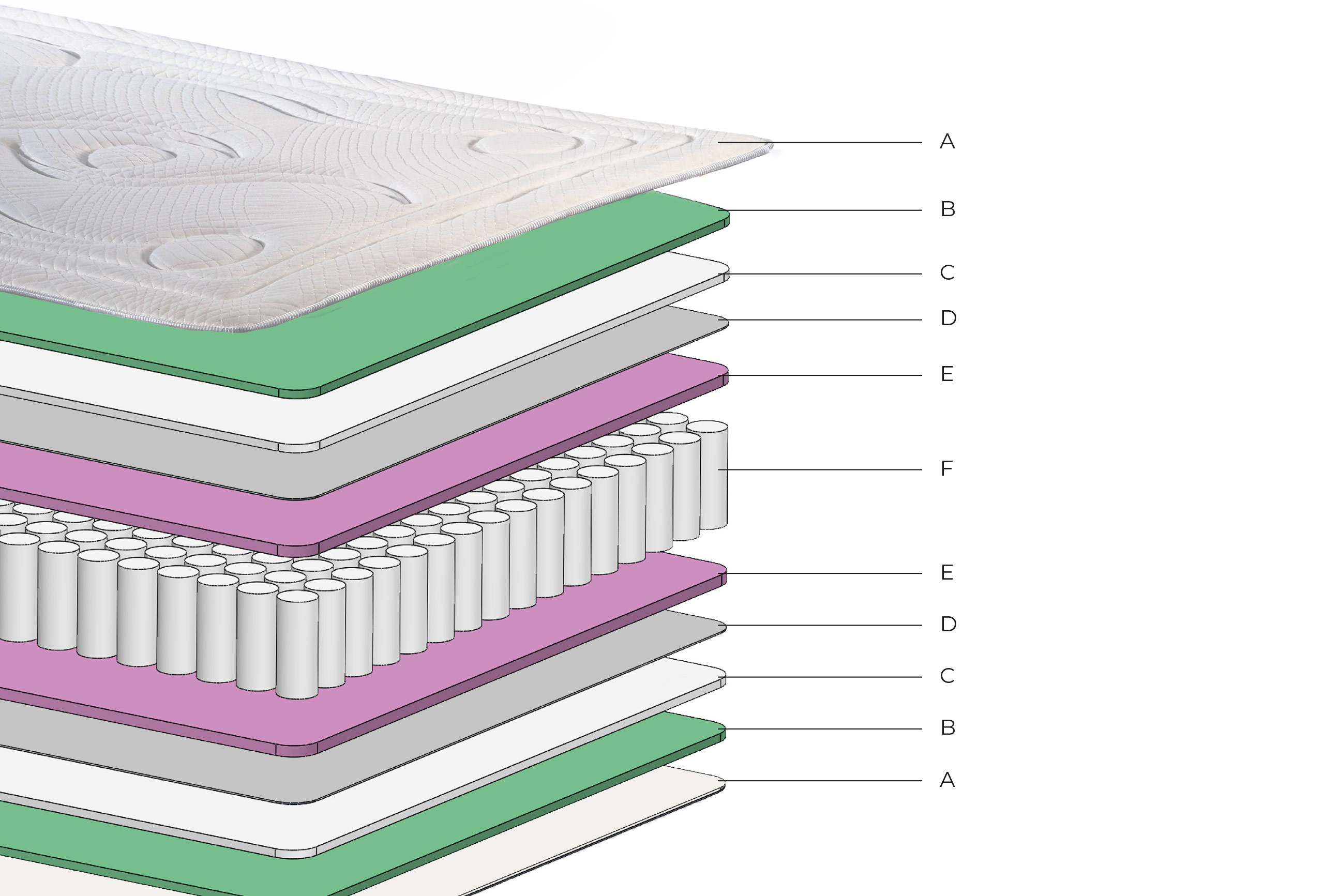 Una capa de tejido no tejido (TNT) aporta estructura, seguida de una espuma rosa suave (20 mm, 30 kg/m³) que aumenta la sensación de suavidad del colchón. En el núcleo, los muelles ensacados soldados por ultrasonidos proporcionan un soporte individualizado. Con 620 muelles/m² y 170 mm de altura, ofrecen un equilibrio ideal entre firmeza y estabilidad. Todo el perímetro está reforzado con un marco de espuma de 80 mm y una varilla de contorno de 5 mm para mayor durabilidad y soporte en los bordes.