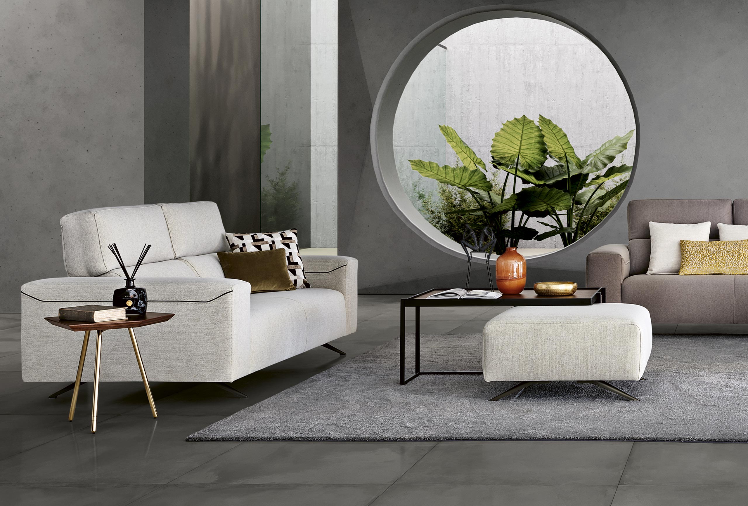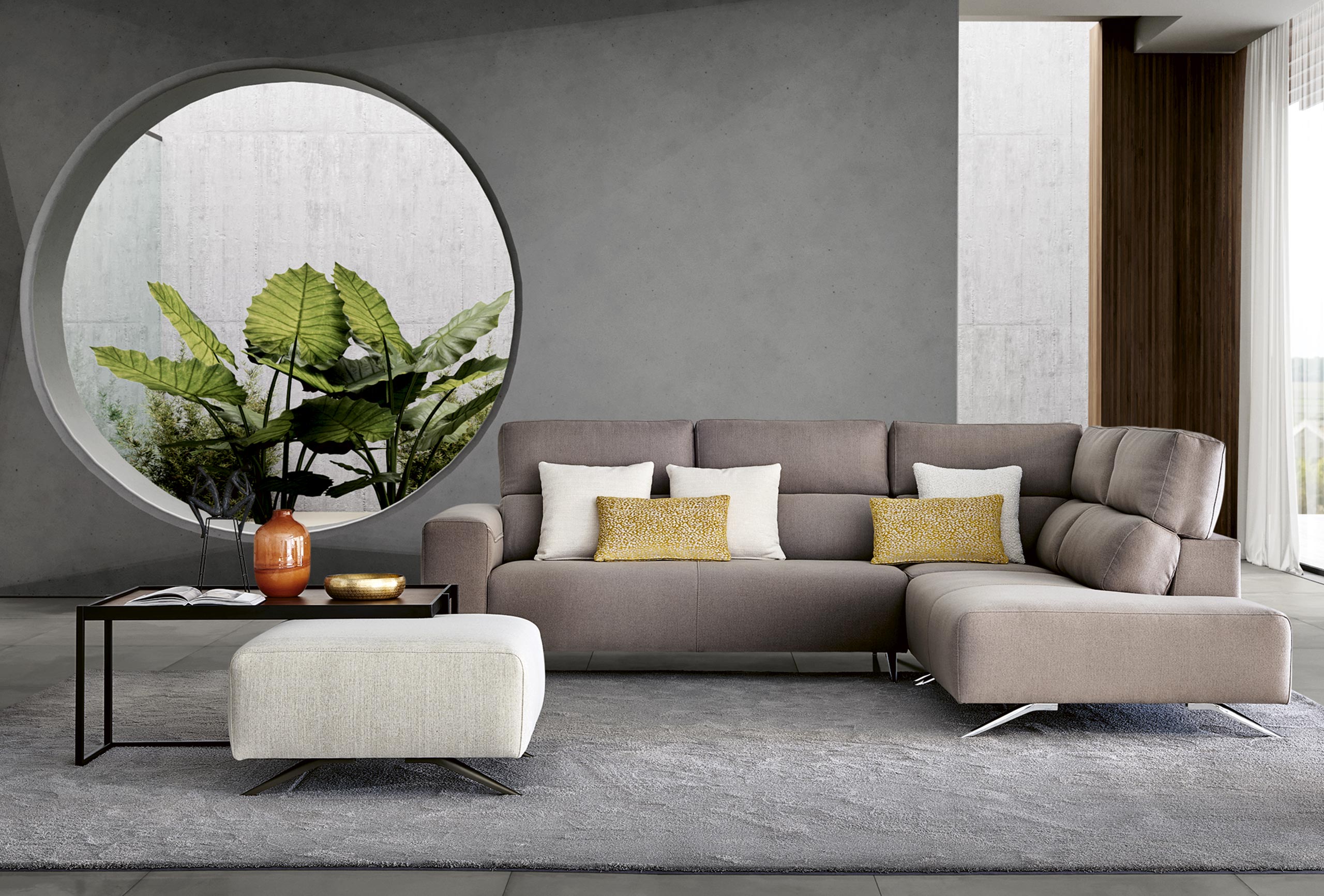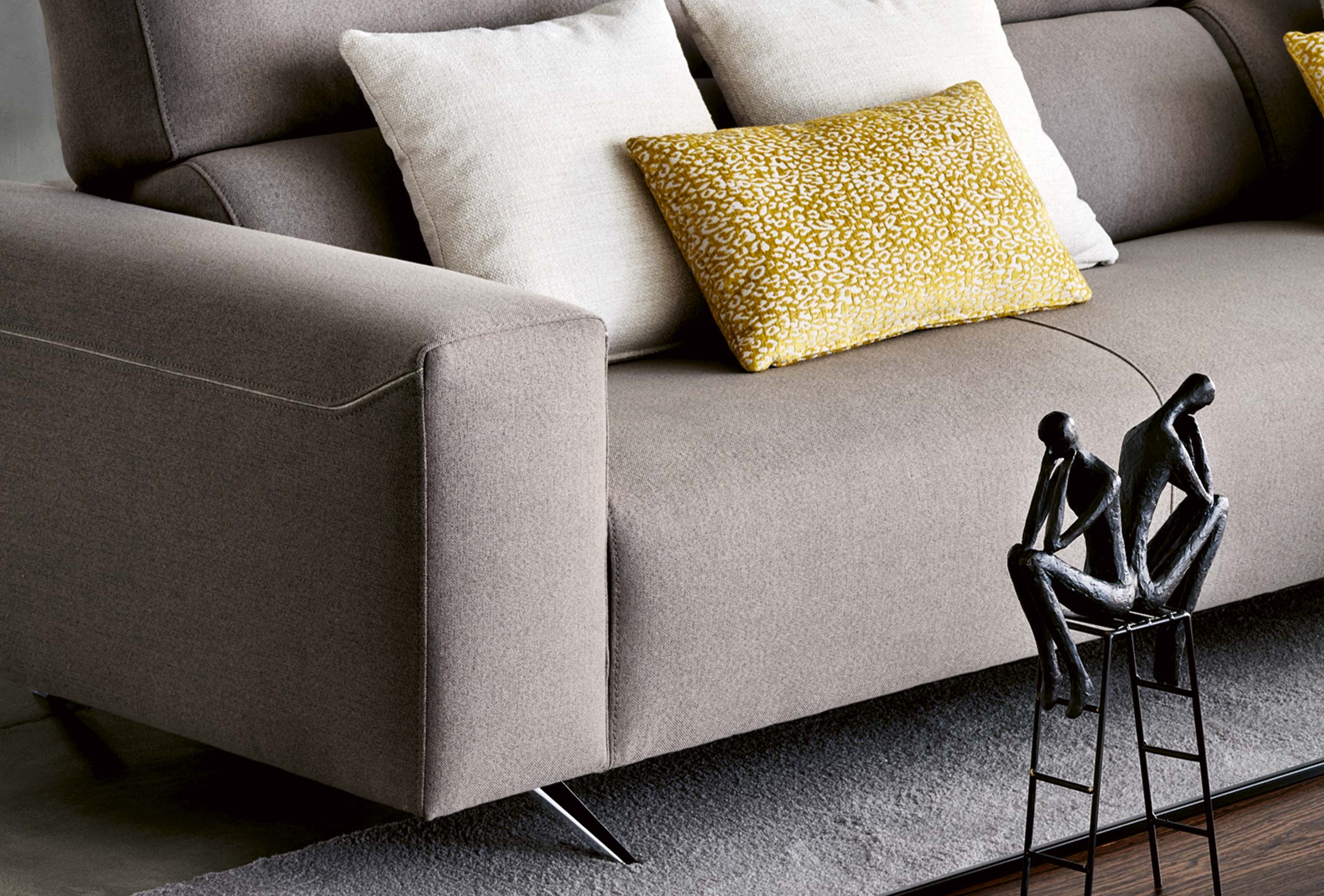 Le système de canapé modulaire Siena est doté de pieds modernes, élégants et au design fin, qui se distinguent lorsqu’on les regarde de côté. Le canapé est conçu pour un soutien lombaire optimal grâce à un double coussin de dossier, et les coussins de dossier reposent sur la structure du canapé, offrant une assise plus profonde et confortable.