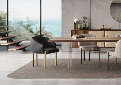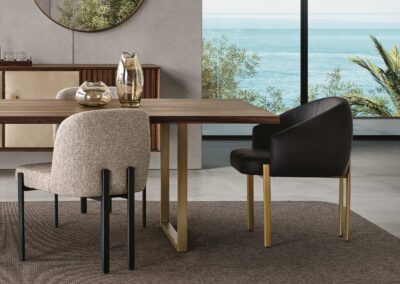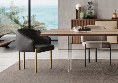 The Sadie Chair, available in versions with or without armrests, is a robust seating option with expressive upholstery that offers maximum comfort.