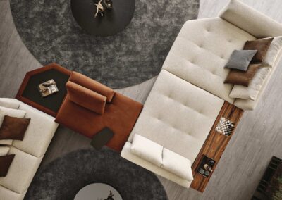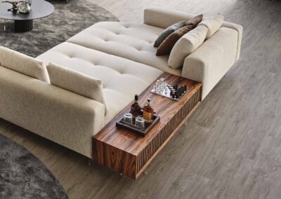 Os Móveis de Apoio Adams introduzem arrumação funcional no espaço sem comprometer a estética leve e refinada. As bases em acrílico elevam o volume, enquanto as superfícies ripadas em madeira criam uma ligação visual coesa e elegante a toda a linha.